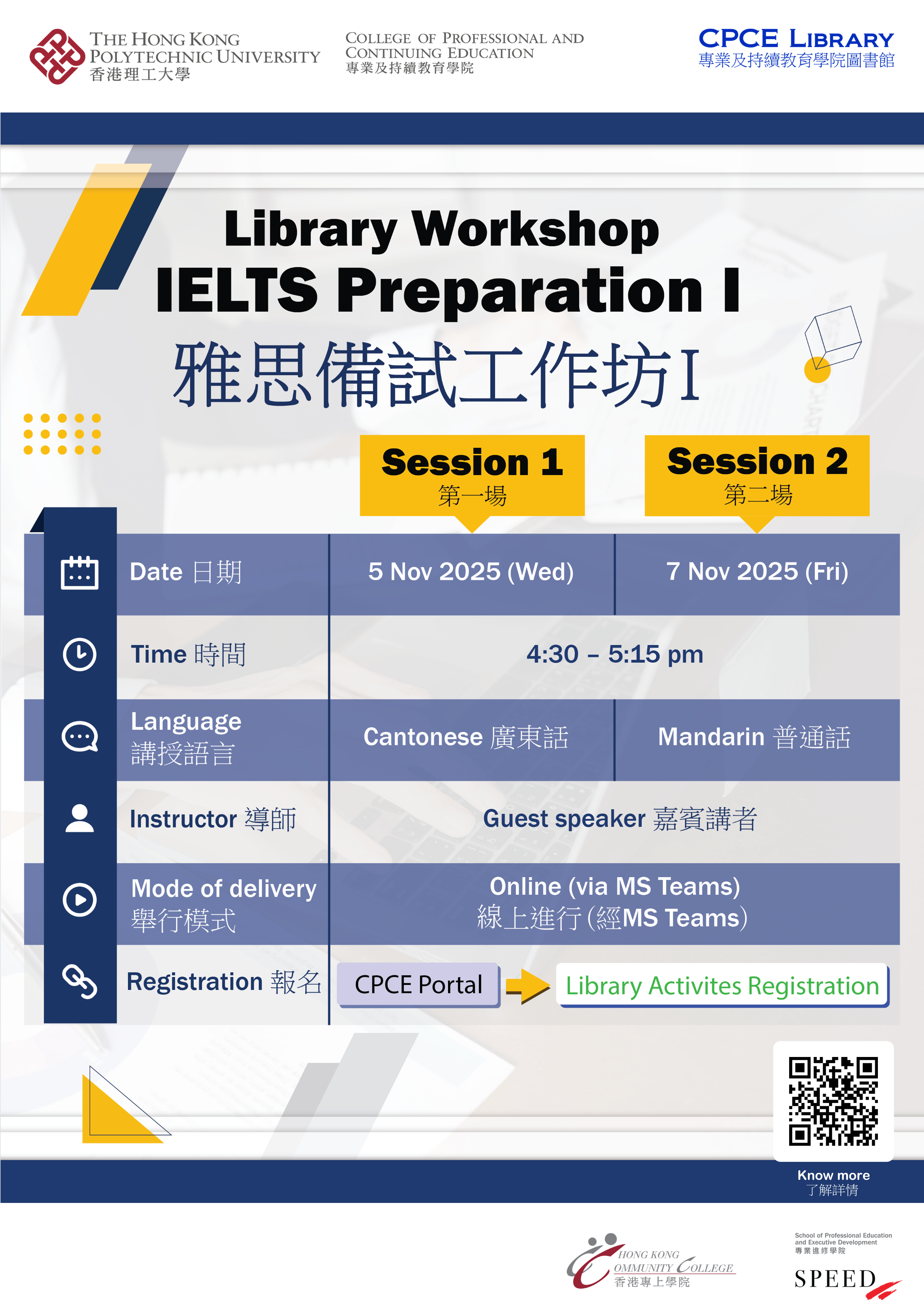 | 3 - 7 Nov 25 | IELTS Preparation Workshop I ![]() 雅思備試工作坊 I |