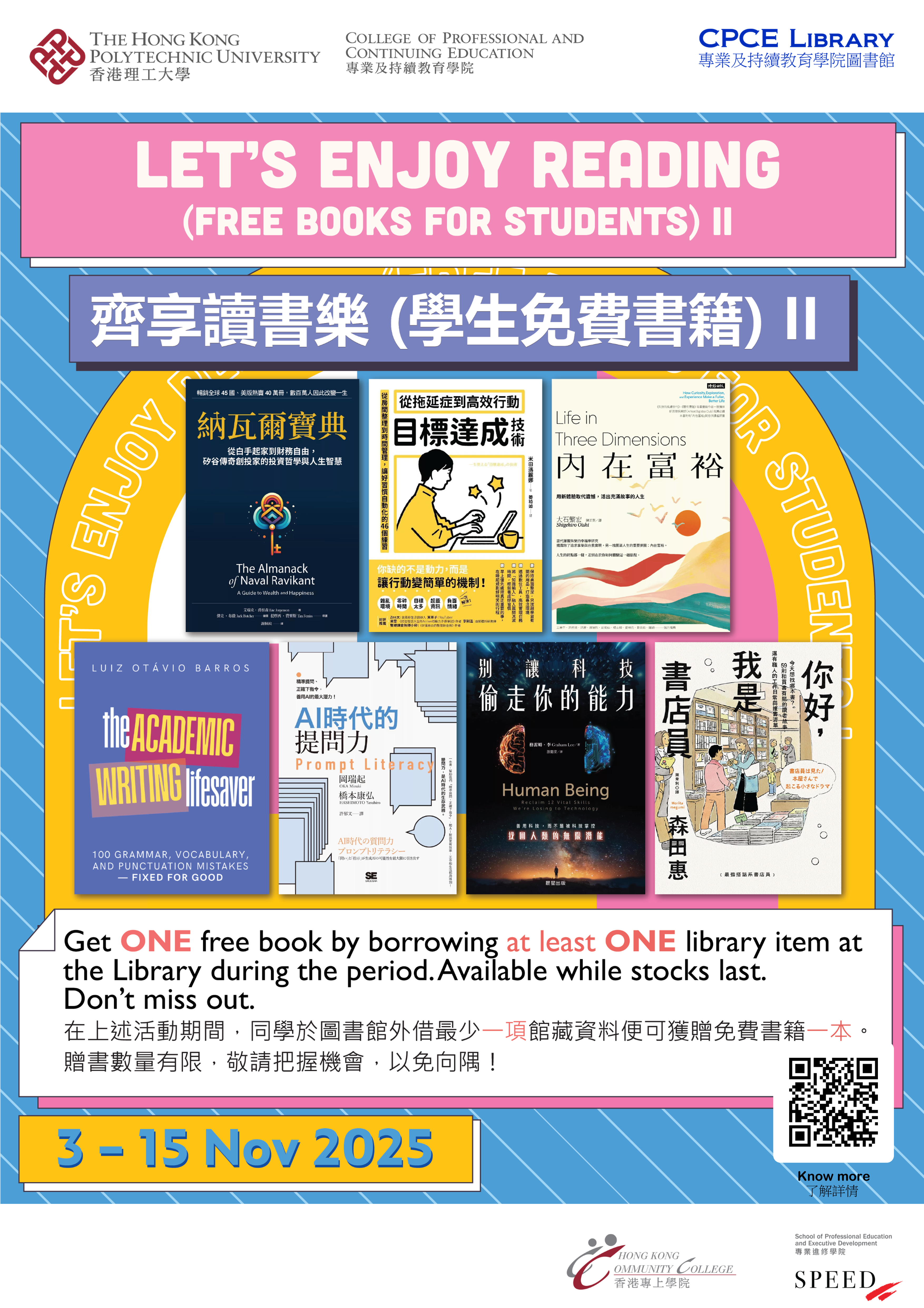 | 3 - 15 Nov 25 | Let's Enjoy Reading (Free Books for Students) II ![]() 齊享讀書樂 (學生免費書籍) II |